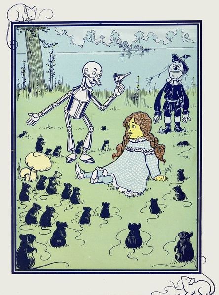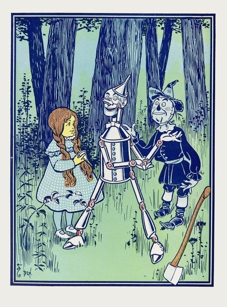 Editor: Here we have "You Must Be A Great Sorceress" by William Wallace Denslow, created around 1900. The monochrome palette and flat, graphic style give it a distinctly otherworldly, almost dreamlike quality. What strikes you about this work? Curator: The stark color palette points to a specific production choice. Note the process. Likely printed using early offset lithography, possibly zinc plates, if we consider the production timelines in popular illustration at the turn of the century. How does the technical constraint, the choice to economize, shape the reading of this piece? Editor: I see, the technical aspect shapes the artistic expression. But what about the choice of subject matter? It seems intentionally whimsical. Curator: Precisely. How is this illustration manufactured and for whom? Denslow made his mark illustrating children's books; that is to say, cultural and commercial objects manufactured at an industrial scale. Understanding the societal function and economic viability of these materials gives insight into their existence. It also encourages a more nuanced viewing. Does the style or technique of production inform the narrative of wonder it depicts? Editor: I see what you mean. Knowing that it was made to be mass-produced changes the way I think about it. It's not just a pretty image. Curator: Consider the paper quality, ink consistency, and the printing process itself. These materials and methods weren't merely tools; they played a crucial role in shaping the artwork's final form and reaching a wide audience. The mode of manufacture informs our interpretation. Editor: It's fascinating to consider how deeply the artwork's physical creation and circulation impact its artistic value. Thanks for expanding my view. Curator: Indeed. Recognizing the materiality encourages more complex and thoughtful views on art-making and the art world.