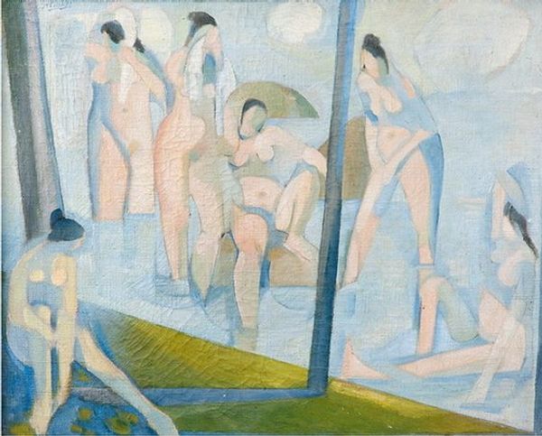 Curator: Let’s turn our attention to André Derain’s “Bathers,” created around 1908 using oil paint. Editor: What immediately strikes me is the density, how these six figures occupy almost every available inch of the canvas, creating a solid, almost sculptural form through their arrangement. Curator: And consider the historical context. During this time, there was an evolving vision of the female nude, often depicted in relation to nature. We might think of the classical Venus, or even some interpretations of Eve, but Derain seems to disrupt those idealized connections. Editor: Absolutely. He breaks from the soft lines and idealized forms you often see. Here, the bodies are robust, rendered with thick brushstrokes and a deliberate distortion of anatomical proportions. It’s as if he’s less concerned with a perfect likeness and more focused on capturing the raw physicality. Curator: But the very presence of the bather is itself significant. In classical terms, water possesses a dual symbolism. It represents both purification and destruction, thus associating women in mythology with power, knowledge, beauty and the perilous and hidden. These women are presented with little to no background, removing specific geographic symbolism while also suggesting vulnerability. Editor: I think that stripping away those classical associations really directs our attention to the formal elements. Notice the restricted palette, largely earth tones punctuated by areas of deep green and touches of white in the fabric. It enhances the solidity I mentioned and further binds the figures into a single, weighty mass. Curator: Yes, a heavy weight is created. This also adds to a modern re-contextualization. Consider that images of the bather become, for the Modernist painter, an emblem of what the Modernists considered truly important. I suggest it indicates liberation for both art and those often-oppressed, a theme that we can track over time in a non-linear but fascinating study of history and visual language. Editor: That idea of liberation through form is very persuasive. The painting, then, isn’t just about representation; it's about the active creation of meaning through the artistic process itself. Curator: Derain certainly leaves us much to consider about enduring representations of women, and humanity more broadly. Editor: An excellent example of how close looking can unlock multiple layers of meaning.