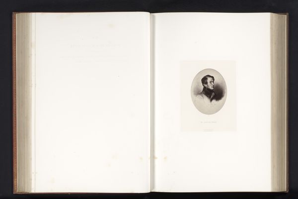 Curator: Before us we have "Munt", a print made before 1886, credited to Maurice Boudet de Paris. It appears to be ink on paper. Editor: My immediate impression is one of austerity. The portrait seems quite small relative to the expanse of paper surrounding it. The limited tonal range reinforces this restrained mood. Curator: Yes, and consider the object itself - an open book. On the right is what appears to be an engraving of a coin, with the profile of a gentleman. Note how precisely the details are rendered, reflecting academic conventions in the 19th century. The paper’s aged and somewhat stained surface provides further material contrast. Editor: Precisely. The decision to frame this image as part of a bound volume speaks volumes, doesn’t it? Perhaps a study of currency and its symbolism? This adds another layer, positioning the figure as not merely a portrait but an emblem of authority, contained within a controlled system. Curator: Furthermore, look closely at the opposing page. There appears to be another fainter design of similar execution style. The two combined offer us symmetry, drawing our eyes to a narrative connection between each facing. Editor: It prompts one to question the intent: to immortalize a specific ruler through currency, or to explore the very nature of power through representative images, thus contributing to a larger political narrative. This pre-photographic age held its authority tightly within these visual confines. Curator: Absolutely. It serves as a valuable artifact, revealing a specific approach to artistry that was integral to academic art of its time. The very constraints become significant components of the piece. Editor: On reflection, I now understand that the formal simplicity enhances rather than detracts from its effect; that the muted quality creates more intellectual resonance in viewing the interplay of power and representation within that historical framework.
