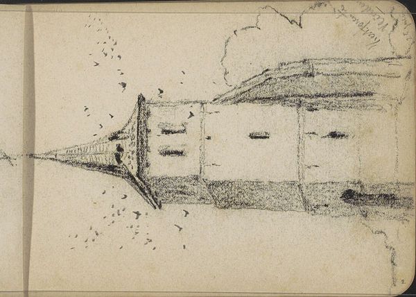 This chalk drawing by Willem Cornelis Rip presents a study in contrasts between form and fluidity. The composition is simple: a building defined by strong horizontal and vertical lines, set against the amorphous forms of what might be trees or clouds. Rip destabilizes clear representation through his choice of medium. Chalk, known for its softness and ease of smudging, renders the architectural lines with a hazy, imprecise quality. The structure itself wavers, questioning the permanence we typically associate with buildings. This tension between the solid and the ephemeral invites us to consider how we perceive stability. The materiality of the chalk further complicates our understanding. Its texture, subtly visible, reminds us of the artwork's physical presence, challenging any illusion of depth or realism. In this way, Rip uses the very substance of his medium to ask: what is real, and how do we know it? This piece serves not just as a depiction but as an inquiry into the nature of representation itself.