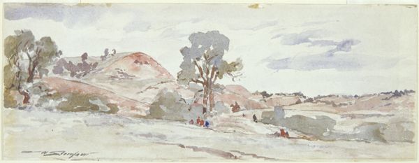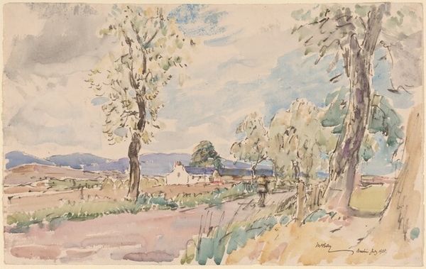 Curator: Ah, this unassuming watercolor landscape, "Road near La Côte-Saint-André," completed by Johan Barthold Jongkind in 1885... it practically whispers secrets of rural France. Editor: My first thought? Melancholy, but also a profound stillness. The muted palette makes it feel like a memory, slightly faded at the edges. Curator: You’ve hit upon something there. Jongkind, though often overshadowed, was a key precursor to Impressionism. Notice his use of watercolor, applying delicate washes *en plein air*. It’s all about capturing that fleeting impression. Editor: Right, and for me the *en plein air* element really shifts the cultural context. There is this element of direct confrontation of light and of atmosphere that places the work squarely in a lineage from the enlightenment preoccupation with scientific observation and empirical exploration. Also the road is the key to accessing that context of exploration for me: Roads were of course critical vectors in commerce, movement, exploration, mapping, etc, and they took on so much significance that they appear to almost personify journeys in art. Curator: Exactly. Roads represent connection and progress, sure, but here… the horse-drawn carriage, the distant hills… It speaks to a quieter, more intimate relationship with the land. Jongkind avoids the bustling activity you see in, say, Monet's cityscapes. He offers this muted, introspective pause instead. Editor: What strikes me most, though, are the symbols embedded. Even something seemingly straightforward, like the specific positioning of trees on that hillside, gives me something deeply embedded into the cultural imaginary of stability and reliability. But it also plays well against the uncertainty of the light… how quickly this scene might be altered, obscured. Curator: So, what lasting impression does this brief, peaceful vista offer you? Editor: A deep yearning, I must admit. A desire for that calm, but tinged with a awareness of the ever-present shift… that is what a symbol might offer if taken into consideration. Curator: For me, Jongkind's simple study reminds that sometimes, the most profound observations are the quiet ones.