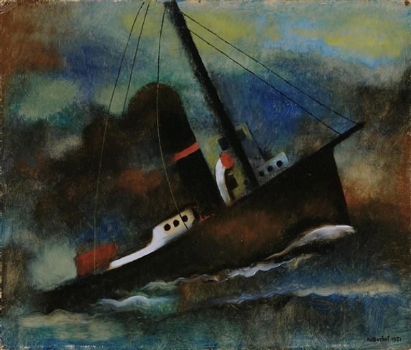 Editor: This is "The Mysterious Boat," an oil painting created by Odilon Redon in 1892. The juxtaposition of the bright yellow sail against the brooding blues and greens is striking! What do you make of it? Curator: Intriguing. Notice the application of paint. Redon isn't concerned with mimetic representation. Rather, observe how he uses colour and form to evoke a particular sensation, a mood. Editor: It's very evocative! There is something about the dream-like color palette that pulls me in. What is the relationship between the foreground and the background here? Curator: Excellent question. Foreground and background seem to merge through the dissolution of distinct lines. This flattening contributes to the work's enigmatic quality. Redon abandons traditional perspective, privileging the expressive potential of color. Editor: So, it’s less about realistically depicting a boat and more about the feelings or ideas that the boat represents? Curator: Precisely! The symbolism lies not in concrete allegories, but in the suggestive power of form and color. Consider how the yellow sail dominates the composition—what kind of emotional weight does that bright contrast add to the overall effect? Editor: It draws my eye upwards! Like there is something luminous that might pull me out of what feels like a gloomy atmosphere. Thanks! Curator: You've intuitively grasped the formal tensions at play here. This interplay reveals Redon's unique aesthetic vision. The dialogue between colour and form is key. Editor: That’s a useful approach that I can use to interpret art in the future.