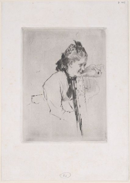 Editor: Here we have Niels Skovgaard’s "Faster Cathrine," an etching from 1884. It feels incredibly intimate, like a stolen moment. The lines are so delicate, but they create a powerful sense of quiet introspection. What do you see in this piece? Curator: The intensity is striking, isn’t it? Though rendered simply, "Faster Cathrine" holds a depth of symbolism. Her averted gaze suggests a disconnection, or perhaps a deep inner contemplation. This image captures more than just a likeness; it's hinting at Cathrine’s psychological space. Notice the stark contrast between the light on her face and the dark background. Where do you think the artist wants us to focus? Editor: Definitely her face. The contrast makes it the focal point. So, her averted gaze and the light emphasize her inner thoughts. Do you think there's a specific meaning to that expression, like sadness or longing? Curator: Perhaps. Or even defiance. The realism style here provides not only a depiction, but also a cultural context. Images such as these preserve memory. She is not looking at us. Instead, her look might preserve a different emotional geography. The symbols are embedded within, such as hairstyle, dress, and the simple lines creating powerful emotional weight. What else is present to your view, if you focus on the psychological presence this image evokes? Editor: That's fascinating! Now that you mention it, there’s a resilience in her posture, even though her expression seems withdrawn. It's like she's guarding something precious. Thank you for sharing. It has really changed how I see the print! Curator: My pleasure. Art provides the cultural mirror through which we understand and connect with the emotional terrain of ourselves, and others.