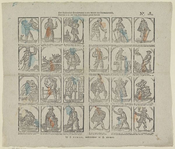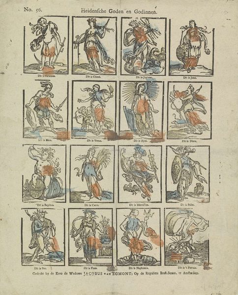 Editor: Here we have "Hier is voor u, ô jeugd! die 't leezen staag beginnen, Te vinden nieuwe vreugd, / Van goden en godinnen, en wel voornaamst van dien, die de heidens gunste biên," a print engraving dating between 1806 and 1830 by Johan Noman, currently housed in the Rijksmuseum. It's filled with all these different figures, and while it seems like an orderly grid, I can’t help feeling it chaotic. What do you make of it? Curator: Chaotic, perhaps! But is chaos not merely order we haven't yet deciphered? Each of these squares bursts forth, a playful performance, the stage filled with gods and goddesses vying for our attention, for our 'gunste,' as the text declares. Look at the figures--who strikes your fancy? Does stern Minerva's shield whisper tales of strategy? Or perhaps jolly Bacchus calls you closer for a merry wine tasting? Each vignette feels a glimpse into a boisterous Olympian party. Editor: I see, they're all individual stories contained in small rectangles like panels from a larger, grander narrative...sort of like a comic. Curator: Exactly! And like any great tale, there are layers. Consider the historical backdrop. Neoclassicism adored antiquity, these characters resurrected from forgotten myths... yet here they’re rendered in such playful, almost cartoonish simplicity. It tickles me. Almost winks! The artist knows he's drawing from old material and seeks to make something modern and amusing. The top translates roughly as 'Here is for you, O Youth, who love to begin reading, to find new joy, from Gods and Goddesses' It implies this is an alphabet of myth – or a set of examples – aimed for instruction but laced with entertainment! Did it work? Editor: It does, yes! It actually makes me want to dive into mythology. I thought Neoclassicism was mostly serious, somber paintings of emperors! Curator: Ah, that's what's so rewarding. Discovering those cheeky contradictions! I guess myths evolve with how we use them. Thanks to our journey among Gods and Goddesses! Editor: Definitely. I see now that looking closer and thinking about the historical moment is a doorway into truly getting the artist's intentions.