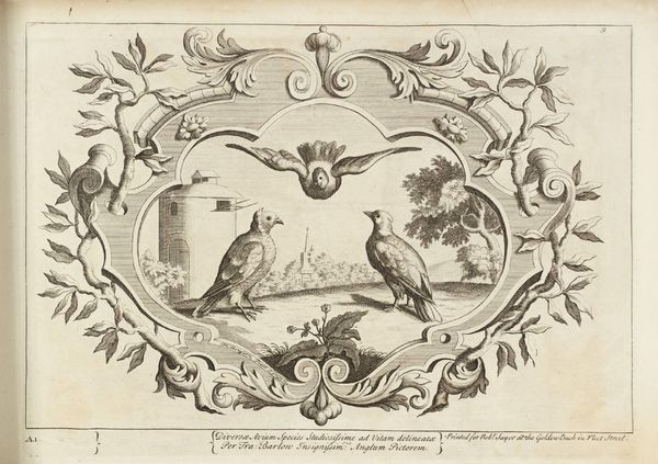 Curator: This is "Twee flamingo's," or "Two Flamingos," an etching and engraving made sometime between 1716 and 1775, currently residing here at the Rijksmuseum. Its creator is Johann Jakob Stelzer. Editor: Well, immediately I'm struck by this wonderfully artificial landscape—the rigid formality battling against the frankly absurd posture of the flamingo on the right. It feels a bit…staged, doesn't it? Curator: Indeed. Note the strategic placement of the flamingos within a structured garden. Stelzer employs a precise technique of line engraving, delineating form and space with remarkable clarity. The flamingos themselves act as exotic emblems. Editor: Emblems, yes, that's perfect. Almost as if someone ordered a very fancy wallpaper and then just said, "Put some…birds…there. Elegant birds. But make them a little weird." Curator: Perhaps reflecting the period's fascination with the exotic and the scientific observation of nature. Consider the contrasting textures achieved solely through line variations—feathers against foliage, stone versus water. Editor: But look how he captures this flat perspective... It's like the backdrop for a slightly surreal play. And are those miniature people in the fountain area? What kind of garden party is that? Curator: That touches on the interplay between the intimate foreground and the receding space of the background, guiding the viewer's eye. Stelzer utilizes this composition to evoke both the grand scale of the estate and a feeling of serene order. Editor: Or controlled chaos! Because those birds don't seem to belong. I bet if they could talk, they’d complain about the lack of proper wading pools and perhaps start a minor scandal with the fountain-folk. Curator: The composition is undeniably rich in allegorical meaning, and perhaps commenting on man's impulse to shape the natural world according to artificial designs. Editor: Maybe! I still see those rebellious birds, yearning for the salty spray of a real beach. Curator: It gives much to consider how we represent our surrounding world. Thank you. Editor: Always a pleasure, truly. This was fabulous, cheers!