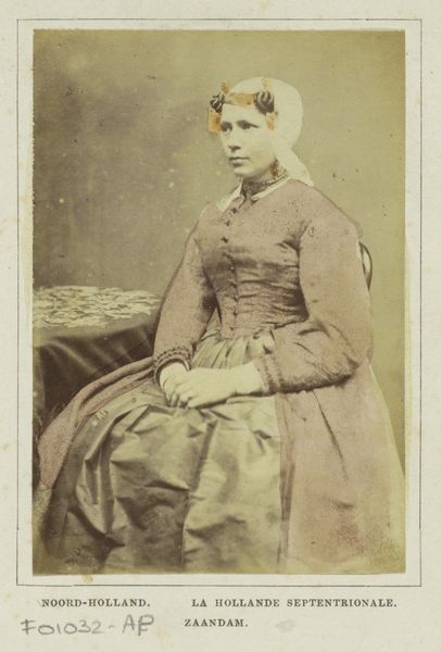 Curator: Ah, here's an intriguing example of 19th-century portraiture. This photograph by Thomas Fall, created around 1877, is titled "Portret van een jonge vrouw, leunend op de leuning van een stoel"—a "Portrait of a Young Woman, Leaning on the Armrest of a Chair" if we translate directly. What springs to mind when you see it? Editor: Immediately, it's this incredible stillness—almost melancholy. The young woman's pose, the subdued palette... it feels like a captured moment of quiet reflection. There's a subtle tension between her slightly wistful expression and the formal setting. Curator: Precisely. The composition adheres to a conventional structure for portraits of the era, certainly. But I see an effort in Fall's approach, to utilize light and shadow to underscore the psychological dimensions of his subject. Consider how the light emphasizes her features, whilst cloaking other parts of her appearance in deep tones of sepia. Editor: The detailing is really striking for a photograph, especially the fabric of her dress and the frills at her wrists and neck. It really does root it in a specific historical period. Though the gaze seems timeless, somehow… like she is considering mysteries that go beyond just what it was like to be a young woman in the late 1870s. Curator: Absolutely, and this is part of the portrait's effectiveness. Whilst Fall observes realism with impressive attention to detail, his use of photography evokes this universal feeling of capturing an essence—the interplay of character and circumstance within an instant. This transcends simply creating an accurate visual representation. Editor: It is remarkable how Fall is able to infuse such personality and depth within the traditional form. Looking at it, I feel almost voyeuristic; as though intruding on a secret reverie. Curator: Indeed. Perhaps it serves as an invitation, reminding us that while techniques and fashions may shift, our human desire to understand ourselves through creative expression remains continuous and constant. Editor: Yes, there is something in it that continues to resonate, and invite a quiet communion across time.