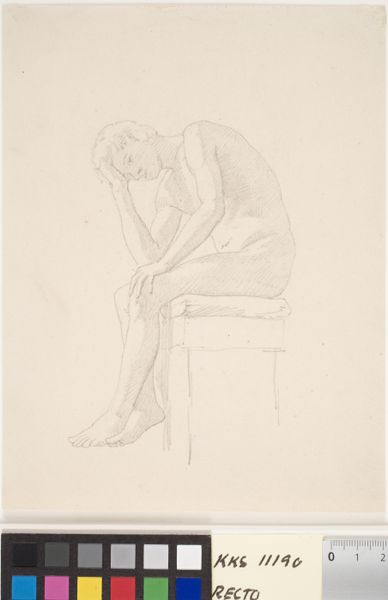 Curator: Here we have an untitled drawing by Hryhorii Havrylenko, currently held at the National Art Museum of Ukraine. It's executed in ink, a study of the human form in its most elemental state. Editor: Immediately, I’m struck by the sense of vulnerability conveyed by the figure. The tight pose, the way she holds her head, speaks volumes, doesn’t it? Curator: Absolutely. Havrylenko's line work here is crucial; each stroke defines shape, contour, and shadow, lending the figure both weight and an ephemeral quality. Editor: The academic art influence is undeniable. It makes me wonder about the cultural context. Nude figures, throughout art history, carry immense symbolic weight, especially regarding how societies view and represent women. Curator: Precisely, the act of displaying the nude became heavily contested within academic circles of the time, serving as a symbol of liberation for some. While this particular work remains untitled, it undeniably fits into the study of line that defined academic traditions. Editor: What about its impact on Ukrainian art specifically? How would this type of piece have been received by a viewing public during that time? Curator: Well, works portraying the nude were often shrouded with contention. They existed, of course, within the realm of study, but were regarded through the socio-political forces in Soviet Ukrainian art. However, the date scrawled on the artwork itself gives a very definitive idea. This piece hails from January 6th, 1969, late-Soviet Ukraine when state restrictions on artistic expression remained, yet artists started carving their path forward. Editor: Interesting how it almost foreshadows struggles, both within herself as presented via the linework, but the struggle of cultural progress at large. I admire the simplicity, almost bravery in its minimalism. Curator: Indeed. There's a power in such economy of means. This piece demonstrates how much an artist can convey with line alone. It's a powerful example of both individual introspection and reflection of artistic expression during its time. Editor: So, ultimately, it offers us more than just an aesthetic experience. It invites a critical engagement with form and its social undertones during the latter end of Soviet art history. Curator: Exactly. Havrylenko’s "Untitled" challenges our understanding of tradition while quietly alluding to shifts happening during the Ukrainian-Soviet climate.