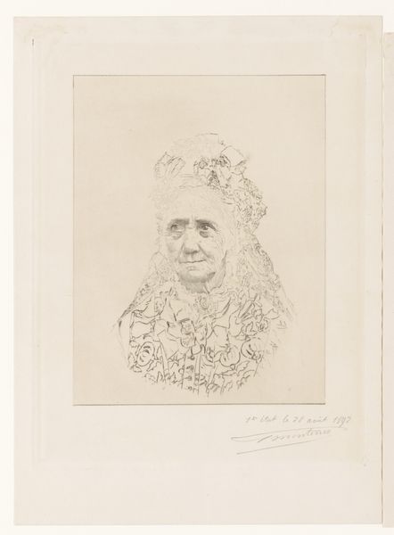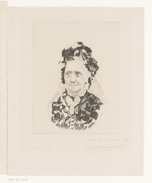 This is a portrait of an unknown woman by Georges Montenez. It was made as an etching in France in the late 19th or early 20th century. The image presents us with a formal portrait. The sitter is presented in the style of a studio photograph, facing forward in a composed and seemingly neutral fashion. But consider the date and the context. What does it mean to be a woman in France at this time? How would she be seen by society? The work also makes us think about the institutional history of art. What are the artistic conventions that dictate how women should be represented? Are these conventions being upheld or challenged? To understand this work better, a historian might look into the history of fashion, the representation of women, and the role of photography and printmaking in shaping social attitudes in France. Only then can we fully understand the complex ways in which this image speaks to its time.