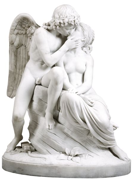 Curator: Here we have Julius Schultz's marble sculpture, *Adam and Eve*, completed in 1881. The stark nudity immediately grabs your attention, doesn’t it? Editor: Yes, definitely. The figures' vulnerability is almost palpable. Eve looks to be resisting Adam; their body language suggests a complex moment of awareness or perhaps even shame. What statement do you believe Schultz was trying to convey? Curator: Think about the social context of late 19th-century Europe. Sculpture like this, steeped in neoclassicism, was not just about aesthetics. It reinforced established social hierarchies. Schultz presents Adam, the patriarch, in a moment of thoughtful, perhaps troubled reflection, but he is very much in control, standing. How do you view Eve in this dynamic? Editor: I see her kneeling, partially shielding herself, as a clear sign of submissive fragility. It definitely speaks to power dynamics inherent in how women were viewed at the time. So it reflects cultural biases through a seemingly ‘objective’ artistic lens? Curator: Exactly. Sculptures like this often served a didactic purpose, subtly reinforcing dominant ideologies through the prestige and perceived moral authority of art institutions. Look at where this piece is exhibited, SMK—Statens Museum for Kunst. Placement solidifies meaning. Does viewing it this way shift your understanding? Editor: It does. It's easy to get caught up in the aesthetic beauty of the marble and the mastery of the human form. But understanding its historical and social context opens a new realm of interpretation. It forces me to ask what other accepted norms are actually present. Curator: And that’s the critical step! Questioning not only the artwork but the institutions that legitimize it, helps us perceive deeper social truths. I have learned new ways of questioning, thanks to you!