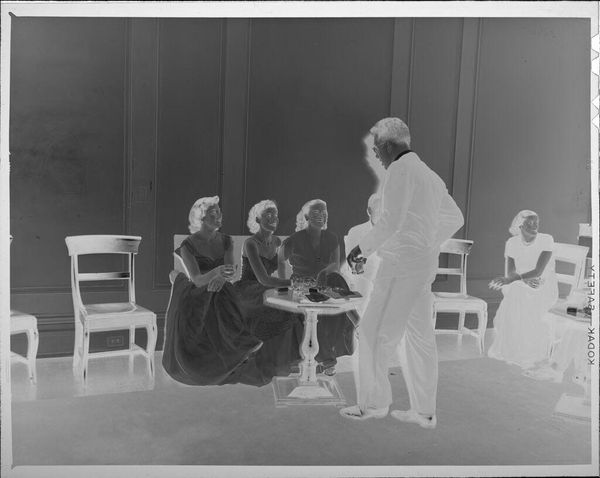 Editor: This is an untitled photograph by Lucian and Mary Brown, showing people dressed formally at what looks like a party. It's fascinating how the negative space gives the image a ghostly, ethereal quality. What can you tell us about it? Curator: Given it's a photographic negative, we must consider the material process itself. The emulsion, the development, the choices of the photographers in their darkroom practice. It seems to capture a moment of leisure and consumption, but the negative form disrupts the familiar comfort of such scenes. Editor: So the negative space actually calls attention to the making of the image, rather than simply recording the party itself? Curator: Precisely. It foregrounds the means of production, the chemical processes that transform light and social ritual into an object. Editor: That's a great point. It really shifts how I see the image. Curator: Indeed, it makes us consider the labor and materials that went into creating this representation of leisure.