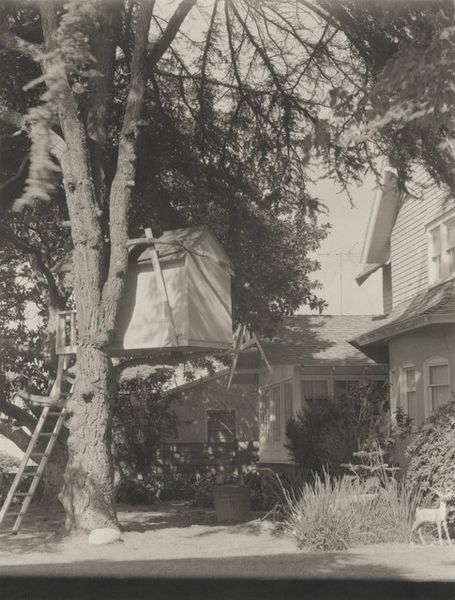 Editor: This is a photograph titled "Dajaks," taken sometime between 1903 and 1907. It’s a black and white image portraying three men standing on the steps of a wooden structure. The clarity and detail of the photograph are remarkable, almost ethnographic in its presentation. What strikes me most is how the vertical lines of the steps and building contrast with the horizontal stance of the figures. What do you see in this piece? Curator: The starkness of the monochrome enhances the geometric relationships at play here. Notice the interplay of light and shadow, especially how it defines the planes of their bodies and the texture of the wood. The composition itself seems deliberately structured, almost architectonic. Is this purely representational or is it inviting us to analyze the formal elements? Consider how the photograph’s sharp focus and deep contrast contribute to its almost sculptural quality, elevating it beyond a simple portrait. Editor: That's interesting, the sculptural quality... I was focusing more on the documentary aspect, but I can see how the composition itself creates a sense of depth and volume, independent of what it represents. Is there something beyond the simple geometric structure? Curator: Precisely. And ask yourself what kind of space is created by the composition. Notice that it isn't an expansive vista, or some other feature of the natural world. Here it seems, in the sharp lines and high contrast, that the space exists solely to serve the purpose of isolating and highlighting these individuals. Editor: So, by focusing on the formal elements like line, contrast, and composition, we can extract a meaning that goes beyond the surface portrayal of these men? Curator: Exactly. The medium of photography, devoid of color, allows these fundamental elements to take precedence. It forces us to contemplate the essence of form and representation, independent of other superficial embellishments. Editor: I never considered analyzing a photograph this way! It's fascinating to think about how the visual structure contributes so much to its overall impact. Thanks for expanding my perspective. Curator: A close viewing reveals hidden layers. There's always more to discover beyond the representational surface.