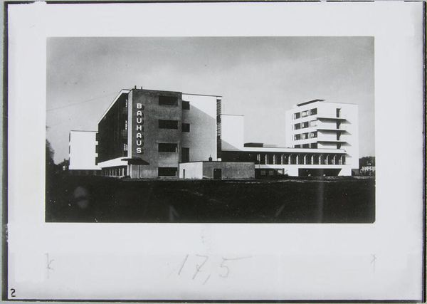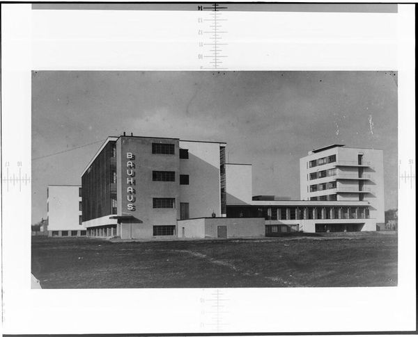 Curator: This is a photograph of the Bauhaus Building in Dessau, taken by Klaus Hertig between 1925 and 1926. Editor: It strikes me as strikingly balanced, almost austere. The geometric forms and monochrome palette create a sense of calculated precision. Curator: Indeed. Hertig captures the Bauhaus ethos perfectly. Consider the school's mission to unify art, craft, and technology in service of a new social order. Editor: And you see it reflected in the composition, in how line and form and shape and arrangement interact to create something purposeful. Curator: Absolutely. The building itself was conceived as a Gesamtkunstwerk, a total work of art promoting a functional and socially progressive environment. Editor: A very potent example of form following function. Well, I feel enlightened by our shared experience. Curator: As do I. It’s a powerful reminder of the Bauhaus’ lasting influence on art, architecture, and design.