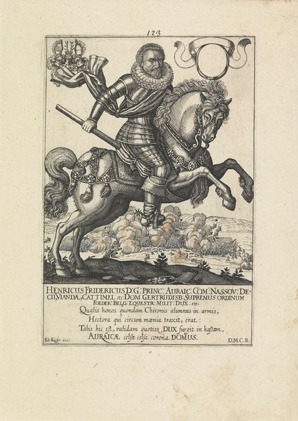 Editor: This is *Lijmstokloper*, or "Lime Rod Walker," an engraving from 1588 by Heinrich Wirich, housed at the Rijksmuseum. What strikes me is how oddly dressed and equipped the central figure is. He seems to be weighted down with the tools of bird-catching, yet his clothes suggest wealth. How do you interpret this work? Curator: Well, on the surface, we see a figure equipped for a hunt, but considering the social context of the late 16th century, we can interpret this as a critique of societal folly. The "Lime Rod Walker" likely symbolizes those caught in earthly pursuits and foolish desires, much like birds are trapped by the sticky lime. Consider the opulence of his attire against the apparent absurdity of his task – a sharp contrast highlighting the vanity and misguided priorities of the elite. Editor: So, it's a commentary on class and privilege, perhaps? Is Wirich suggesting that the wealthy are just as susceptible to foolishness as anyone else? Curator: Precisely. Think about the rising merchant class and their pursuit of status. This image would speak to that specific moment. Wirich seems to question where they place their value, equating chasing fleeting pleasures to trapping birds. The numerous textual inscriptions reinforces the connection between worldly desires and their inevitable downfall, but also point to a potential liberation from such entrapments through the recognition of true freedom in a divine existence. What's more interesting is to ask: what exactly does 'freedom' signify for people living at the edge of modernity? Editor: That really reframes my understanding. I was focusing too much on the literal imagery without considering the historical and philosophical context. Curator: That is an excellent starting point though, and by combining careful observation and a sense of history, the print now reveals layers of meaning connected to the human condition, as pertinent then as it is today. Editor: Absolutely. Now I see the social commentary more clearly and I appreciate Wirich's ability to embed such layers of meaning into a seemingly simple image. Curator: Indeed. It reminds us to look beyond the surface, and examine art through an intersectional lens that acknowledges historical realities and contemporary values.