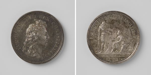 Curator: My first impression is how stately it seems, the wig and robes speak to immense privilege, but it also looks a bit mournful, no? Editor: That’s an interesting reading. What we're looking at is a 1743 silver medal by Martin Holtzhey, commemorating the arrival of Gustaaf Willem van Imhoff at the Cape of Good Hope, on his way to becoming Governor-General of the Dutch East Indies. It offers a fascinating glimpse into the visual language of power at that time. Curator: A carefully orchestrated bit of propaganda, you mean. I suppose the presence of Justitia on the reverse clinches that. What is she doing under those strangely assertive rays of light? It’s so baroque. Editor: Indeed! Justitia, as you note, is a complex emblem herself – blindfolded and balanced on the reverse alongside that very date, but it’s all quite purposeful, presenting Imhoff's governance under divine guidance and objective, virtuous leadership. The inscription along the rim reinforces this: "Soes Meliorem Sorte Tuli," or, "Fate has brought a better destiny". A meal ticket! Curator: Better destiny for whom, I wonder? These symbols and their implications are loaded when we consider Dutch colonial history. What was Holtzhey intending here, really? It reads like pure celebration. Editor: Holtzhey was commissioned to produce the medal for those present at the celebratory meal hosted in Imhoff's honor. The goal was clearly to establish and disseminate a favorable image of him and his future rule. Medals like this played an important role in shaping public opinion and reinforcing the legitimacy of colonial power. It’s about crafting and controlling narratives. Curator: And those narratives stick. A simple image embedded with authority. The weight of colonialism condensed in metal… it's a potent object. It really makes one think about how carefully crafted symbols have real-world consequences. Editor: Precisely. Even seemingly small objects like this medal can reveal a lot about the society and politics of their time. Curator: Absolutely. Well, thank you for guiding me through that! It’s incredible how much we can glean from such a little token. Editor: It's been my pleasure! Art always whispers stories.