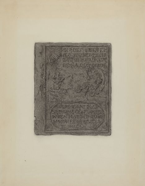 Editor: We’re looking at a "Pa. German Fireback" from around 1942, made of metal by Charles Von Urban. It's a relief sculpture, and its grey tones and classical composition give it a somber, almost antique feel. What cultural narratives are embedded in a piece like this? Curator: It's interesting you pick up on the 'antique feel', especially given its date. While seemingly decorative, firebacks served a practical function in colonial-era hearths, protecting the back wall from the fire's heat. More than that, I think they were a site of cultural expression. Look at the female figure, flanked by what looks like 'FRVH' and 'LING', surrounded by lush plant motifs. How does that image speak to a visual language about the roles women played in early German-American settlements? Editor: It looks like it could reference Spring—the German word for that is 'Frühling', right? Maybe that connects to the 'Pa. German' identity, intertwining nature and homeland? Curator: Exactly! 'Frühling' as an embodiment of new beginnings, but set against the backdrop of colonial life. Von Urban might be touching upon complex ideas about migration, cultural memory, and the expectations placed on women to nurture and preserve tradition within new landscapes. Consider the lack of precise detail--are we invited to reflect upon an idealized and simplified depiction of German-American heritage? Editor: So, beyond the literal purpose, it becomes a powerful emblem of cultural identity and perhaps even longing? Curator: Precisely. It invites questions about what "home" really means and who gets to define it, across generations, and who benefits from that nostalgia. What I'm taking away is a more nuanced view of both utility and artistic intention. Editor: That's fascinating. I definitely see the piece differently now.