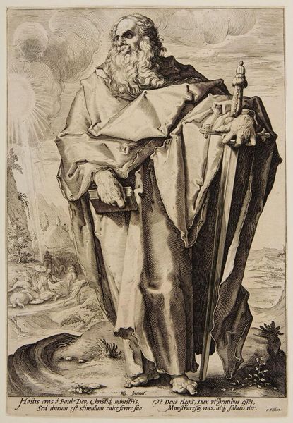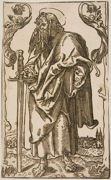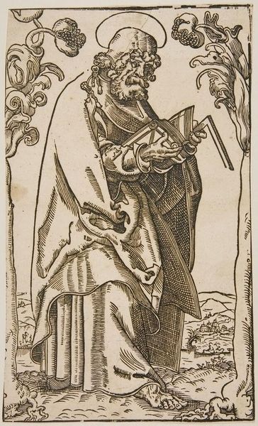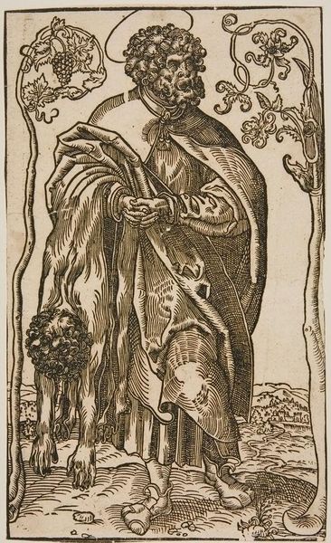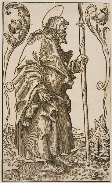 Curator: Let's discuss Lucas Cranach the Elder's depiction of "Saint James the Greater," currently held at the Harvard Art Museums. Editor: Immediately, I'm struck by the density of symbols. The walking stick, the pilgrim's hat... a potent image of journey and faith. Curator: Indeed, the meticulous cross-hatching and woodcut technique Cranach employs here highlight the material process—reflecting the late medieval printmaking boom and the wider availability of religious imagery. Editor: Notice how James is framed by those strangely animate floral borders. They seem to underscore his role as a mediator between the earthly and the divine. Even his eyes seem to look beyond us. Curator: We can also consider the social context. Cranach, aligned with the Reformation, was working during a period where the role of saints was being actively debated. Editor: All this visual language points to a deeper cultural memory. This James connects with centuries of pilgrimage, struggle, and spiritual aspiration. Curator: The materiality then becomes a conduit for broader social shifts. Editor: Precisely. It's quite fascinating how the weight of symbolism can be held within a fairly simple, yet powerful image.