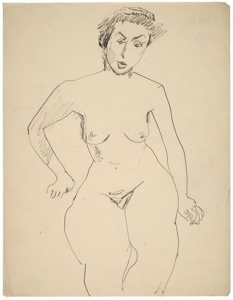 Editor: Here we have Mark Rothko's "Seated Female Nude, Right Hand on Right Thigh, Frontal View," a drawing. I'm immediately struck by the starkness of the lines and how they capture the figure’s weight. What stands out to you when you look at this piece? Curator: It's the relationship between line and form that compels me. Rothko, though celebrated for his color field paintings, demonstrates here a masterful control of line. Note how the seemingly simple strokes define the figure, creating volume and depth through their varied thickness and density. Editor: I see what you mean about the line variations. It’s almost like he's sculpting the figure with ink. Is that intentional, do you think? Curator: Intention is a tricky word, but consider how the cross-hatching in shadow areas like under the breasts and along the thighs creates a tangible sense of mass. The lines aren't merely outlines; they participate in the creation of the form itself. Think about how the negative space around the figure is as important as the lines forming her shape. How does this interplay impact the viewer? Editor: It makes the figure feel more present, almost sculptural despite being a sketch. It's interesting how the abstraction pushes the viewer to engage more actively, using our eyes to build her body and her presence. I've never looked at drawing like this before. Curator: Precisely. Rothko focuses attention to form, surface, shape and the art-making process itself. This piece allows us a valuable perspective of the artist as an expressive interpreter of form, not merely a recorder of reality. Editor: This definitely gives me a fresh appreciation for Rothko's range and his manipulation of basic elements of art. Thank you for this insight.