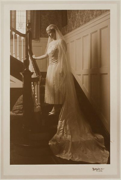 Editor: This is an untitled portrait by Martin Schweig, housed at the Harvard Art Museums. The woman on the staircase has such a stately presence. How do you see this piece within the context of portraiture? Curator: It's interesting how Schweig uses the staircase. Instead of simply framing the woman, it becomes a stage. Do you think this elevation impacts the viewer's interpretation of her social standing or the politics of representation at the time? Editor: Absolutely, it seems to amplify her status, almost like a royal portrait. It makes me wonder about the intended audience. Curator: Precisely. Consider how the image might function within the culture of the time, perhaps reinforcing societal expectations or challenging them in subtle ways through the woman's gaze or posture. This image offers us a window into a very specific social performance. Editor: This has made me see the portrait as more than just an image of a woman; it's a statement about identity and societal expectations.