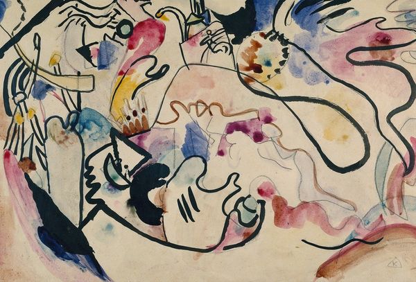 Curator: Welcome. Today, we're exploring Joan Miró's "Groupe De Personnages" from 1938, a painting rendered primarily in watercolor. What strikes you first about it? Editor: An almost primal exuberance. Despite the constraints of the medium, Miró achieves a sense of uninhibited joy, wouldn't you agree? The whimsical forms practically dance across the canvas. Curator: Interesting. What I immediately see is how Miró created this work at a crucial moment. This was right before the Spanish Civil War fully engulfed the country. The watercolors suggest resource limitations, an urgency in production dictated by impending political turmoil, wouldn't you say? Editor: Perhaps, but notice the sheer delight in the biomorphic shapes! The colours create their own world of associations, independent from direct, real-world references. The painting creates its own structural logic and doesn't allude to what you may see with a landscape, history painting or even still life. Curator: But consider the context! Miró was deeply affected by the rise of Fascism. "Groupe De Personnages" needs to be seen as a reaction. His turn toward a more 'primitive' style reflects a broader artistic move toward challenging traditional values. Editor: I can agree to that. I understand it, however I am more inclined to be attracted to his aesthetic arrangement, to understand its appeal beyond his moment of making it. Miró seems far more occupied by surface level qualities - even his 'figures' read less as social commentary and more as compositional strategy. They work formally to move your eye, create contrast. Curator: Fair enough, but the seeming "simplicity" belies the intensity of the historical situation. This wasn't just about aesthetic choices; it was about engaging with a world on the brink. How artists at this moment began employing novel techniques, especially in distribution as posters or inexpensive prints, so they could respond rapidly to emerging threats. Editor: I concede that appreciating the historical backdrop undeniably adds a layer of richness to the piece, although there are layers there before such historical interpretation. Overall, an incredible piece that continues to stir interesting questions about aesthetics and context. Curator: Absolutely, a perfect example of art reflecting and refracting its historical moment, inviting continued critical engagement.