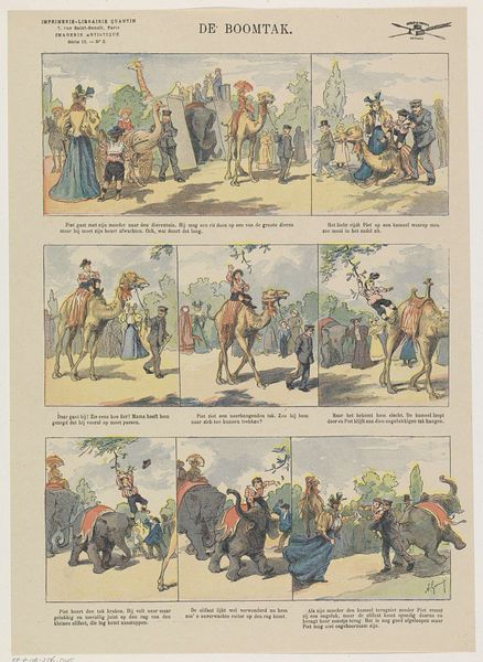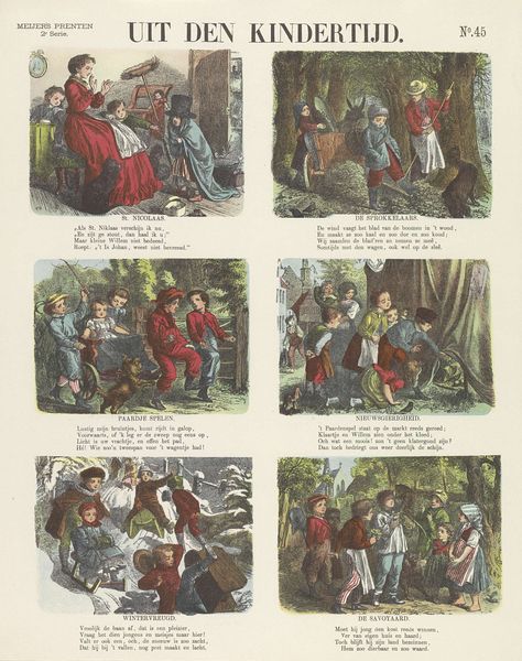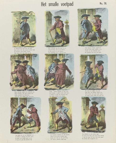 Curator: Well, this work is titled *De geschiedenis van Hans*, or "The History of Hans," an 1873 print by Arie Kunz. It appears to tell a story through these sequential scenes. Editor: Immediately, I'm drawn to the grid-like composition. Six rectangular frames, each a miniature world unto itself, but working in unison. And the colors – pastel, muted – lend it a sort of old-world charm. Curator: Absolutely. Consider Hans himself. He is the common thread. Each scene portrays a distinct stage or event in Hans's life. Narrative art like this offers a window into the past, often encoding morals, beliefs, and social structures of the time. What do you notice about the way Hans is presented across these scenes? Editor: There's a consistency to his form – same clothing, roughly same stature. Yet, the figure appears to evolve within each box. The light in the lower right frame conveys, without needing to consult its narrative text, that some form of revelation or completion occurs there. Curator: Exactly! He symbolizes the everyday person embarking on a journey, whether literal or metaphorical. His transformations might signify societal expectations or lessons learned in adulthood. It also touches upon the common theme of naiveté and how simple minds or pure intentions often face difficulties in the complex social and economic realities that adults are expected to master. Editor: Notice how consistently the scenes center Hans within a circular frame. He consistently appears, whether in trade, or being cheated of an honest wage, or reveling in newfound knowledge and wealth. Each tiny box centers the character within life events – his character traits becoming a focal point to build the tale around. Curator: Precisely. Kunz taps into a very common symbolic language through that central figure. Editor: So, as a sequence, each carefully contained incident creates a closed, orderly symbolic circuit, which reinforces Hans’ life as meaningful, knowable, contained. I'd propose there's comfort in that order, the suggestion that individual actions will inevitably have impact and repercussions in your world. Curator: Very astute. Analyzing art through symbols unveils such historical understanding about our continued fascination with visual symbols that convey emotional, cultural, and psychological truths. I think this offers many interpretive possibilities. Editor: And breaking apart this complex symbolism has revealed a clear, almost comforting, vision in Kunz's sequential artistry. I'll walk away with that circularity as a formal accomplishment and thematic reminder.