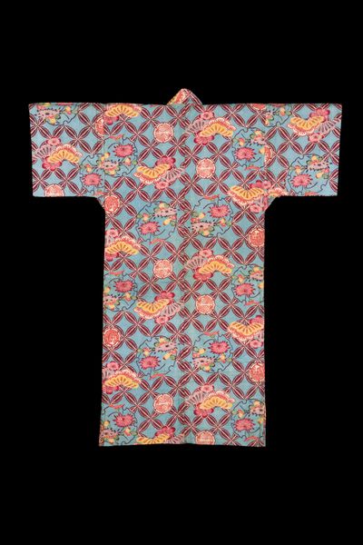 Editor: We are looking at a “Chijiri robe with yellow embroidery” dating from the early 20th century. It’s a fascinating textile piece housed here at the Minneapolis Institute of Art. What strikes me is the boldness of the dark fabric and the intricate pattern, almost like a complex maze. What do you see in this robe? Curator: I see a powerful intersection of tradition and personal expression. The kimono form itself is loaded with cultural significance, but this one diverges from typical representations, doesn’t it? That abstract, almost psychedelic pattern disrupts the usual naturalistic motifs. To me, it raises questions about individual identity versus social conformity in early 20th century Japan. Editor: So, you are saying that it could be a statement against the social expectations put upon the wearer? Curator: Precisely. Consider the social constraints placed particularly upon women at that time. This robe could be read as a subversive act, a quiet rebellion expressed through personal adornment. The repetition of the pattern, although visually pleasing, might also symbolize the cyclical nature of societal pressures. Do you find the colour palette to be significant? Editor: Definitely, the contrast between the dark robe and the gold embroidery is striking. It suggests a kind of hidden luxury or inner strength. I hadn’t really thought about the person wearing the robe before. Curator: And how it was used, too! Consider the craftsmanship—the time and skill poured into creating this unique piece. Who was the artisan? What was their life like? The lack of attribution pushes us to consider the overlooked labour behind even seemingly simple garments. Editor: It’s fascinating to think of the garment as more than just a beautiful object but also as a silent commentary. I’m starting to see how personal adornment can become a powerful form of social commentary. Curator: Indeed. And hopefully, appreciating the artistry here makes us question our assumptions about art, craft, and the role of women in shaping visual culture.