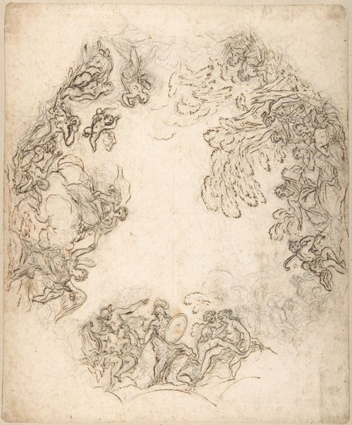 Giovanni Battista Beinaschi made this drawing, Glory of Angels, in pen and brown ink with brown wash over black chalk, sometime in the 17th century. The process of drawing has a unique place in the history of art. Here, we can see the artist's hand so directly. Every line, every area of shading, testifies to Beinaschi's skill. The choice of pen and ink allowed for precise linework, defining the figures of angels in dramatic poses. The brown wash adds depth and volume, creating a sense of movement and light. The drawing would have been a study for a larger composition, perhaps a fresco or an altarpiece. Drawings are a tool for artists to explore ideas, work out compositions, and refine their techniques, so they are not exactly ‘art’ and not exactly ‘craft’. A drawing like this reminds us that all art emerges from a process of making, and a real commitment to materiality.