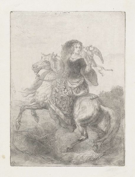Curator: Here we have Giovanni Domenico Tiepolo's etching, "Angelica bedreigt door zeemonster wordt bevrijd door Ruggiero op hippogrief," created between 1757 and 1760. Editor: The composition really grabs you. The light etches create a dramatic contrast between the frantic energy of the winged horse and the seemingly defeated Angelica chained to the rocks. You can feel the texture in the monster's skin. Curator: This piece captures a dramatic scene from Ariosto's epic poem "Orlando Furioso," a popular subject during the Baroque period. It's essentially a rescue narrative. Look at Angelica, the damsel, victimized and offered up for sacrifice. What are the social dynamics at play? What commentary is being made about gender and power in art? Editor: Absolutely. And let’s not ignore the technique of the etching. Think of Tiepolo meticulously working on the copper plate, controlling the acid to create the image in layers. There is an artisanal aspect that underpins this work's material value, especially given its mass production potential at the time. This intersection of craft and myth is something important. Curator: Right. Mass production also made it possible to democratize a traditionally exclusive narrative and challenge pre-existing structures in which only wealthy patrons can contemplate the "true beauty." Editor: And yet the cost, the very material substrate upon which this story lives. Was it made accessible to Angelica, metaphorically? Consider how the raw materials shape its socio-economic reality, what the means of production were... Who was exploiting what labor to create the media of this image? Curator: That is insightful. By acknowledging that complexity and by recognizing how social power and materiality were always deeply interwoven in the historical narrative—through production, distribution, and even through visual storytelling—we can gain so much understanding. Editor: Seeing this piece from the perspective of its creation adds so many more layers. Understanding the material gives one greater appreciation for what it portrays.