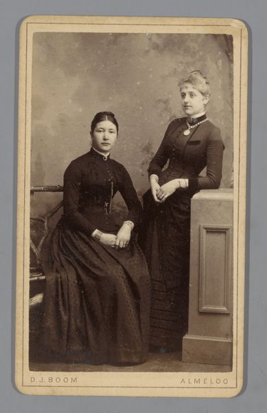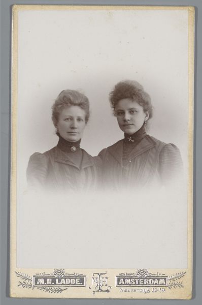 Curator: Let's turn our attention to this piece by E. v.d. Kerkhoff, "Portret van Ida en Loes v/d Wijck," created around 1895. It's a gelatin silver print, currently housed here at the Rijksmuseum. Editor: Gosh, it has this melancholy, old-world charm. Those serious faces – it's like they're carrying the weight of centuries on their shoulders! Makes you wonder about their lives, doesn’t it? Curator: Indeed. Contextually, studio portraiture like this was becoming increasingly common for middle-class families seeking to immortalize themselves. But there are social scripts at play here: the deliberate posing, the controlled expressions. It reflects the rigid social expectations placed upon young women at the time. Their clothing, for instance, conforms to societal norms of the period. Editor: Absolutely, but there’s also a quiet rebellion in those eyes. Like they're enduring the whole 'portrait' rigmarole, but with a private, unamused commentary running in their heads. I've totally been there. The slightly faded, sepia tone just adds to that feeling; like a beautiful, ghostly echo of their existence. I keep trying to invent what the world was to them. Curator: Right, and that melancholic sentiment is quite potent. Consider also how genre-painting conventions may have influenced the photographer, shaping the subjects' presentation. Their postures and gaze communicate very clear power dynamics, ones inextricably linked to their gender and social standing. Editor: See, I love that you go deep, but I find the pure mystery intoxicating. They're like phantoms from a dream, inviting endless speculations. Each time I look, a new possible story pops into my mind – it’s neverending inspiration. Curator: And that invitation to speculation is itself productive! By engaging with the historical conditions, we can begin to consider how the constraints these women faced have evolved, and how certain modes of representation perpetuate even to this day. Editor: That’s great. I'll probably just go back to making up secret stories about their double lives, full of adventure and late night pastries. What do you think happened after the sitting? Curator: That's something this photograph may keep a secret forever, unless one dives deeper. Editor: Wonderful; something to ponder, certainly.