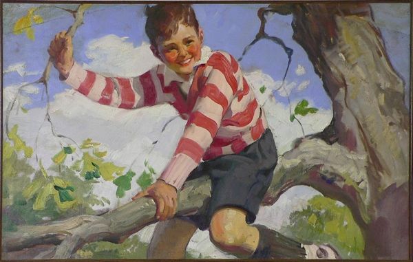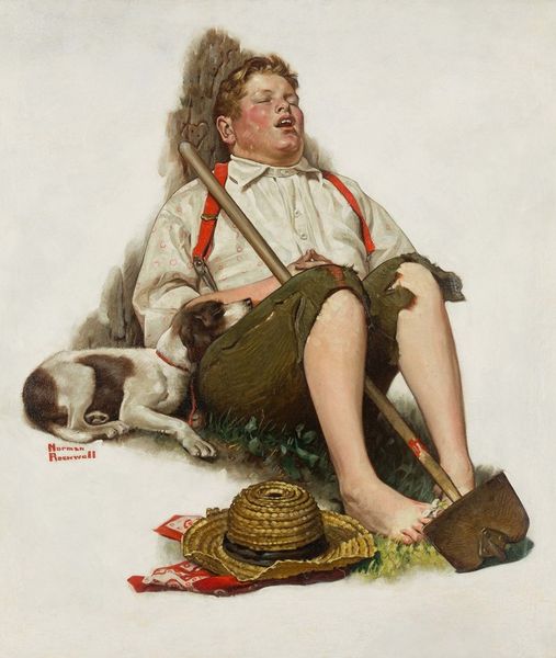 Editor: Norman Rockwell's "Little Boy and Beagle," painted in 1926 with oil paint, strikes me as a study in American boyhood. There's a certain innocent swagger to the boy's pose. How do you interpret this work? Curator: Rockwell's work, seemingly simple, is deeply embedded in the social fabric of its time. What appears as innocence is, in part, a construction – a visual representation of idealized American values that were heavily gendered and class-conscious. How does the boy's attire, for instance, contribute to this understanding? Editor: He's dressed in a collared shirt and tie, but also baggy shorts and striped socks, making him seem caught between formality and play. Is Rockwell commenting on social mobility here? Curator: Possibly. But I'd also suggest considering the racial context. Rockwell's vision often overlooked or marginalized the experiences of people of color. In what ways does this absence speak to the limitations of the idealized narrative he presents? And, following on from that, where would this boy and dog 'fit' into society? Editor: I see what you mean. While the image exudes a certain warmth, it also reinforces a very specific and limited view of American life. One that is highly sanitized. I didn’t pick up on it immediately, I will be more critical next time. Curator: Precisely. Analyzing art through an intersectional lens challenges us to see beyond surface-level charm and consider the power dynamics at play. Editor: So, by looking beyond the immediate appeal, we can see the artwork as a product of its time, both reflecting and shaping social norms. Curator: Indeed. And that's crucial for a deeper, more meaningful understanding of its place in history and its relevance today. I find it striking that Rockwell continues to have a prominent role, particularly because many things have now changed in society. Editor: I agree; it offers a perspective which challenges the status quo, promoting inclusivity and broader representation within art history. Thank you!