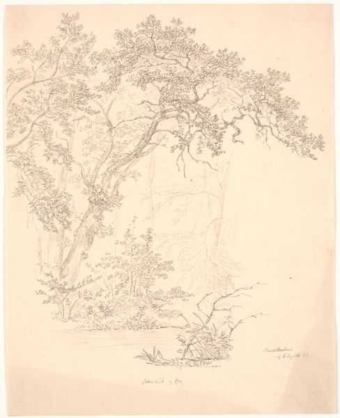 Andreas Schelfhout created this landscape drawing with graphite on paper. The composition captures a scene dominated by a steep embankment to the right, and a body of water that recedes into the distance on the left. The drawing's strength lies in the artist's ability to suggest depth and texture using only subtle variations in line weight and density. The fallen tree trunk and the figures add a human scale, inviting viewers to consider their relationship with the natural world. Schelfhout employs a semiotic system of signs that reference classical landscape traditions, while also engaging with emerging Romantic sensibilities. The deliberate placement of elements creates a dynamic interplay between foreground and background, drawing the eye through the scene. This structured arrangement emphasizes the artist's engagement with the formal aspects of landscape drawing. The drawing remains open to multiple interpretations, and the beauty of the work exists in its formal qualities, inviting continued exploration.