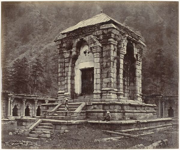 This photograph of Candi Semar was taken by Isidore Kinsbergen, probably in the late 19th century, using a process involving silver salts on a glass plate. The result is a richly detailed image, capturing not only the structure but also the people who inhabit its surroundings. What strikes me is the contrast between the enduring monumentality of the Candi, made of precisely cut stone blocks, and the ephemeral nature of the photographic medium. The Candi’s construction would have involved many hands – quarrymen, masons, laborers – all contributing to a collective effort across generations. Kinsbergen’s photograph, by contrast, captures a single moment in time, dependent on the specific skills of the photographer and the chemical processes he employed. This image invites us to consider the relationship between labor, time, and representation. The Candi embodies the accumulated work of many individuals, while the photograph distills this history into a single, reproducible image, raising questions about how we value different forms of making and their cultural significance.