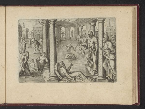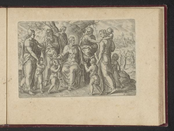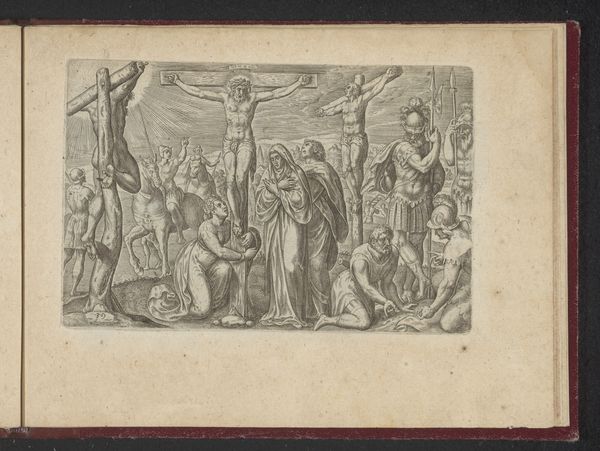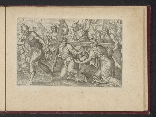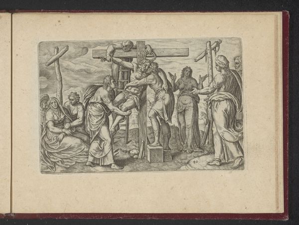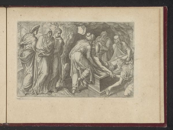 This is Philips Galle's engraving, "Opwekking van Lazarus," created around the late 16th century. The composition, dominated by fine lines and shading, evokes a somber yet miraculous atmosphere. Galle masterfully uses the contrast between light and shadow to direct our attention to the central figures: Lazarus emerging from his tomb and Christ, who stands tall. The lines, meticulously etched, define the folds of the clothing and the texture of the rocky landscape, creating depth and movement within the restricted monochrome palette. The semiotic weight of this image lies in its challenge to fixed states. Death, symbolized by Lazarus bound and entombed, is destabilized by the potent figure of Christ. Through formal elements, Galle visually articulates a narrative of transformation, challenging our understanding of the boundaries between life and death. The artwork operates within a structured religious discourse, yet it also destabilizes these established meanings through its emphasis on visual and emotional impact. It allows for continuous re-evaluation.