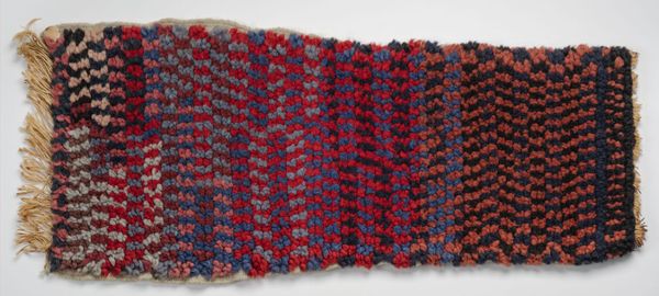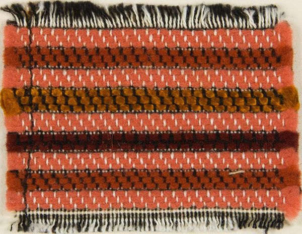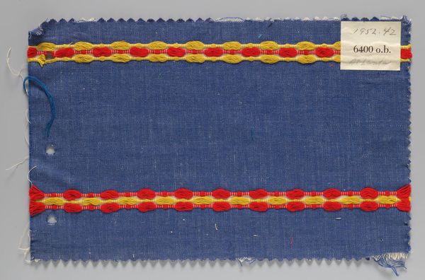 Editor: So, this is "Sample: yellow; grey; blue and red" by the Bauhaus Weaving Workshop. It's this small, textured piece, and the colors are, well, quite muted, but there's something compelling about the simplicity. What do you see in this piece? Curator: It whispers of the Bauhaus philosophy, doesn’t it? Like a tiny woven manifesto! Stripped down, elemental… it’s about the grid, the essential structure. It’s asking, "What is weaving at its core?" It's almost a meditation on the craft itself. Editor: A meditation... I hadn’t thought of it that way. I guess I was too focused on the, dare I say, blandness. Curator: Blandness? Or quiet strength? It’s a sample, a possibility. It’s not trying to shout; it's inviting you to lean in, to consider the potential held within those simple threads. Editor: Okay, I get that. I do feel like I understand the intention behind it much better now. Curator: Exactly! Sometimes, the most profound statements are made in the softest voices.