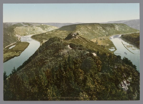 Editor: This photograph, taken sometime between 1900 and 1945 by an anonymous photographer, shows "Gezicht op Alf en Bullay aan weerszijden van de Moezel in Duitsland" - a view of Alf and Bullay on either side of the Moselle River in Germany. I find the composition striking; the river creates a strong diagonal line dividing the image. What elements do you see that stand out? Curator: The river undeniably establishes the dominant spatial logic. Consider how its serpentine form carves a deep recess into the landscape, dictating the placement of the built environment and modulating the interplay of light and shadow. The towns themselves—how would you describe their arrangement in relation to the topography? Editor: Well, they seem nestled within the valley, almost clinging to the riverbanks. The buildings appear small and clustered, contrasting with the imposing hills. Curator: Precisely. Now, observe the chromatic scale. How does the photographer employ color to differentiate planes and textures, thereby constructing depth? The cool tones of the river against the warmer hues of the verdant hills… Editor: I see it. The color contrast accentuates the depth and emphasizes the organic shapes of the hills versus the structured, man-made elements of the towns. Are the somewhat muted tones typical of photography from this era? Curator: Indeed. The photographic processes of that time, combined with the likely hand-coloring, often yield such a distinctive palette. The very artifice of the applied colour warrants attention in any critical reading. And further, have you noticed how the light appears? Does it feel diffuse, lending a certain timelessness? Editor: Yes, the lighting seems soft and even. It almost feels like I'm looking at a watercolour illustration rather than a straightforward photograph. Thanks for pointing that out, I was getting lost in its picturesque appeal. Curator: Not at all. It is the tension between representation and abstraction that makes images so powerful. Editor: This has helped me see the image not just as a pretty landscape but as a carefully constructed visual statement.