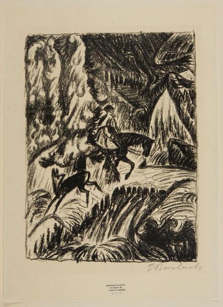 Curator: Ernst Ludwig Kirchner's lithograph, "In the Barracks Courtyard," published in 1916, presents us with a stark vision. The dimensions of the stone are approximately 26.8 by 21.4 centimeters. Editor: It feels like a claustrophobic nightmare, all harsh angles and brooding shadows. The black ink seems to suffocate the scene. Curator: Indeed, the composition relies on a powerful contrast between positive and negative space, typical of Expressionist printmaking. Note the fragmented forms. Editor: Like shattered pieces of a soldier’s psyche. Look at the frantic energy in the horse's movement! It speaks of inner turmoil, doesn’t it? Curator: Precisely. This work reflects Kirchner's experiences during World War I and his subsequent mental breakdown. The formal elements serve to convey psychological distress. Editor: I see it. The broken lines, the oppressive darkness…it’s a visual scream. It lingers with you. Curator: Yes, Kirchner masterfully uses form to explore the psychological impact of war. Editor: Quite a haunting and evocative print—one that makes you question the cost of conflict.