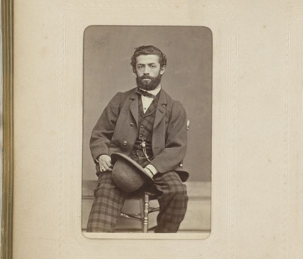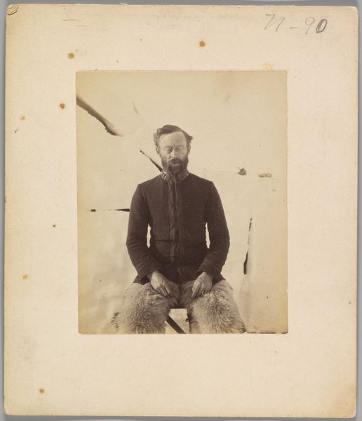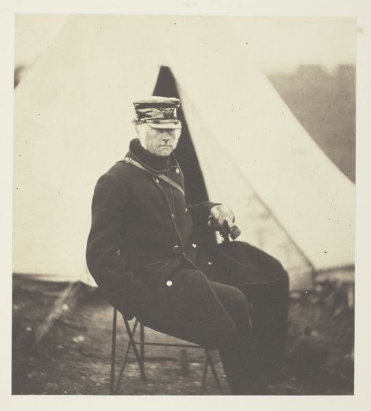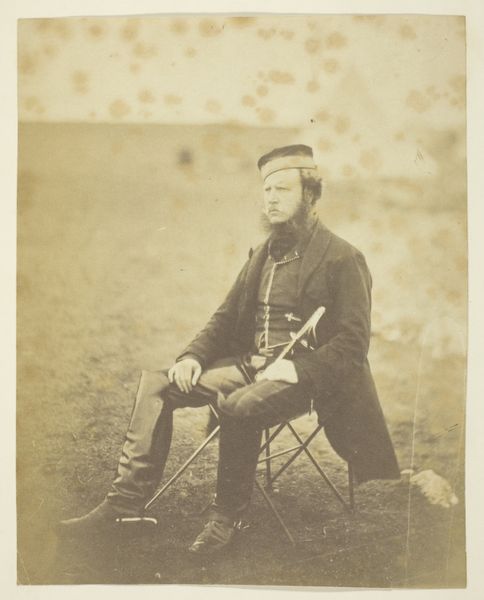 Curator: This albumen print, taken in 1855 by Roger Fenton, offers a portrait of Archibald Gordon, Principal Medical Officer during the Crimean War. Editor: The stark sepia tone lends a feeling of austerity to the scene. He seems weary, yet his gaze is unwavering. One can almost sense the weight of responsibility in his posture. Curator: Note how Fenton's use of natural light illuminates Gordon's face, drawing attention to the details of his expression. The contrast between light and shadow emphasizes the texture of his beard and the intricacies of his uniform. Editor: The photographic process at the time required long exposure, meaning Gordon would have to maintain a still pose. Knowing this detail heightens the poignancy. The very act of sitting for this portrait signifies a certain power, but also the restraints tied to 19th-century military portraiture in wartime. Was this image created for propaganda? Or memorial? Curator: Indeed. What interests me most is Fenton's precise construction. Look at the strategic placement of the spherical object behind him that echoes his figure, subtly shaping the composition. The framing adds a layer of complexity to the overall visual experience, don’t you think? Editor: Perhaps. But for me, it’s about understanding the social landscape of this photo, like what's beyond the frame. Gordon's stoicism tells a compelling narrative that contrasts starkly with our awareness of the Crimean War's brutal realities: class disparities in care and race disparities among casualties, with race often correlating with social class in army ranks. Curator: A fine point. By balancing the formal elements and historical context, Fenton created a lasting work, resonating far beyond its immediate subject. Editor: Yes. Remembering the social complexities provides a context through which the weight of that gaze becomes even heavier.