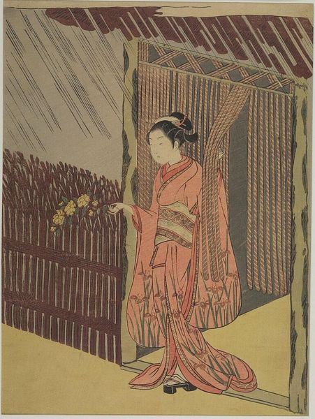 Suzuki Harunobu’s woodblock print, Visual Parody of the Poet Ōta Dōkan, presents a scene dominated by vertical lines and muted colors, punctuated by the soft hues of a woman's kimono. The composition is neatly divided into planes – the falling rain, the gate, and the figure standing in the doorway. The vertical lines create a sense of enclosure, which is softened by the organic forms of the flowers and the woman’s gentle pose. Harunobu subtly plays with cultural and artistic codes. The parody references a famous anecdote of Ōta Dōkan who was once given a mountain rose instead of proper rain gear when seeking shelter. By replacing the warrior with a woman, Harunobu destabilizes traditional heroic narratives and introduces a commentary on gender roles. The print engages with the concept of representation itself, questioning fixed meanings. It asks us to consider how art transforms and reinterprets history, inviting us to question the boundaries between past and present, masculinity and femininity, and the literal and the symbolic.