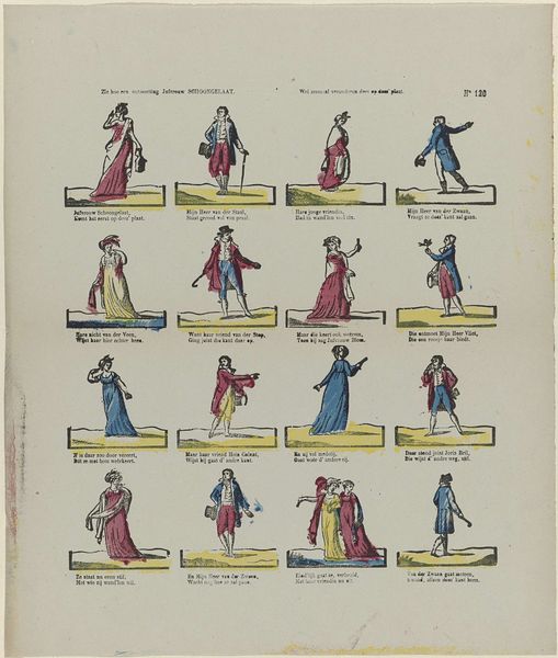 Editor: This print, "Garde impériale Turque," or Turkish Imperial Guard, by Philippus Jacobus Brepols, is dated somewhere between 1800 and 1833. It's a drawing, but made to look like a reproducible print. It reminds me a bit of fashion plates, showing off different uniforms and weapon types. I'm really intrigued by the vibrant colors used; they seem almost theatrical. What stands out to you when you look at this? Curator: It’s funny you say “theatrical”, because I often wonder how "real" these images were meant to be! Realism as we know it? Perhaps not so much. They weren't going for photo-like accuracy. Think of it instead as capturing a sort of essence, a vibe, you know? A stylized version of the Imperial Guard. The artist is playing with a shared idea more than cold documentation, offering these glimpses of what that Guard "felt" like – colorful, bold, distinct. Does that change how you see it? Editor: Absolutely. I was initially approaching it as a historical document, almost clinical in its depiction. But reframing it as more of a "feeling," or even propaganda, unlocks a different dimension. The color choices, then, feel intentional—they're amplifying the "otherness," maybe? Curator: "Otherness" is a powerful word. Back then, there was this almost ravenous fascination with the exotic, the 'Orient.' Images like these both fueled and fed off that fascination, walking a tricky line between genuine interest and, well, something leaning towards spectacle, and a tad reductionist. What did the audience take away when looking at it? Can we look at it now and understand that, or do we see only with our own preconceptions? Editor: It makes you question the artist's intent, doesn't it? It's like, are we viewing a faithful representation, or something filtered through a very specific lens of European perception? Curator: Precisely! It’s that push and pull. It makes me wish I could grab a coffee with Brepols, a time machine, you know? To ask him directly, "What *exactly* were you trying to capture here?" And who knows, maybe the truth lies somewhere gloriously in-between.