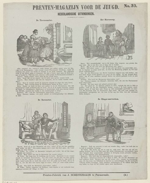 Curator: I'm immediately drawn to the intimacy in this engraving; there's a real tenderness to the lines. It almost feels like flipping through pages of someone’s diary. Editor: This is an engraving dating to 1847 titled “Pieter Nieuwland. – Geb. 5 Nov. 1764, Overl. 14 Nov. 1794” created by Jan Schuitemaker. Considering its origins, what kind of narratives do you imagine it wants to communicate? Curator: The way the scenes are blocked makes me feel I’m stumbling into little vignettes. A person being taught to read; what seems to be a mathematical lesson; what kind of stories of upbringing and growth were intended to speak to the ‘Youth’ referenced at the top of the engraving? Each box feels like a snapshot of a life unfolding, rendered in miniature. I wonder how viewers at the time reacted? Editor: Schuitemaker offers here a fragmented vision of a particular kind of scientific education. Nieuwland, the figure whose biography this work seems to relate, was an important figure within the Dutch scientific Enlightenment. The details presented by Schuitemaker tell us that education, especially scientific advancement, was clearly very much considered an accomplishment worthy of public acknowledgement, almost half a century after Nieuwland’s death. Curator: It's a very deliberate curation, right? There's a careful control to what details are shown. It's so different from how we consume images now, scrolling endlessly through feeds, versus this carefully constructed narrative delivered on a single page. Do you think this piece might speak to broader themes concerning children? Editor: Yes, because of the social and economic structures it valorizes through visual and textual description. Take the attention to literacy for instance, along with that boy demonstratively writing sums with chalk on the wall, for example. What’s so provocative here, I think, is that Schuitemaker doesn't just passively record the history of childhood. He frames its social narratives. Curator: Looking at these small scenes again makes me think that each box represents one verse of the poem written under it. They seem like little illustrations in their own right. Almost like this engraving becomes its own version of illuminated manuscript, bringing text and images together. I like that sense of layering and echoing. Editor: Yes, that layering and echoing between word and image makes this work still so powerful for considering historical themes and personal reflection, which perhaps, when combined, create possibilities for individual development and transformation. Curator: So true, in many ways Schuitemaker gives the audience the resources needed for their personal reinvention by providing this artistic framework of understanding.