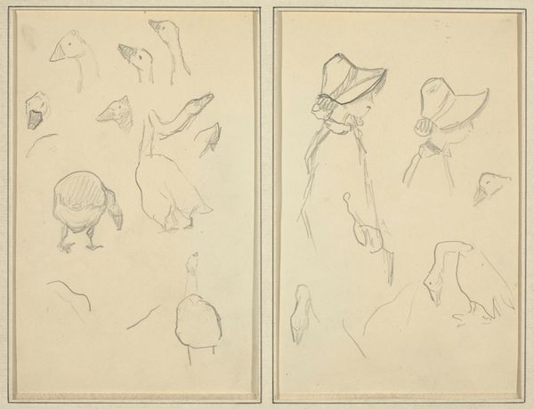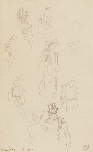 Editor: Here we have Frédéric Houbron’s “Croquis de parisiens,” a pencil drawing dating from 1895 to 1905. It has a delightfully unfinished quality, like a glimpse into the artist’s sketchbook. What catches your eye in this collection of Parisian sketches? Curator: It’s funny you say that. To me, this feels less like a collection of portraits and more like a single, fleeting moment captured from multiple perspectives. Imagine standing on a busy Parisian street corner – all those hats, those faces… Do you see how the artist uses these delicate, almost ephemeral lines? Editor: I do. They give a real sense of movement, a bustling atmosphere. Curator: Exactly! And that's impressionism in a nutshell – the sensation of a moment. The slight awkwardness, almost caricature-like nature, contributes to this effect, right? It’s like the artist is chasing the soul of the scene. It wasn't about meticulous rendering but seizing something true. Editor: So, it’s not really about the specific people? Curator: I think it is about ‘types’ or certain styles which convey something deeper than mere physical appearance. In these fleeting pencil lines, we see reflections of that era's sensibilities and perhaps a playful nudge at society itself. The drawing really manages to be both lighthearted and thought-provoking, wouldn’t you say? Editor: It’s amazing how much personality comes through with so few lines. I was so focused on it feeling unfinished, but now I see that it's a style choice. Curator: Precisely! And in that, lies its magic. Always good to be nudged from the beaten path, oui?