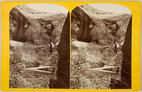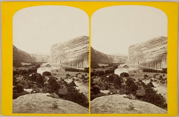 Curator: John K. Hillers captured this stereograph, titled "Head of the Narrows," presenting us with a dual perspective of a canyon's embrace. Editor: There's a somber coolness to it. The layered rock seems to bear witness to immense geological time. Curator: The river narrows, channeling not only water but also the symbolic journey, perhaps alluding to life's passages and constraints. The repetition in the stereograph enhances this sense of confinement, almost a visual echo. Editor: I'm struck by the process. The material reality of photography in that era—the glass plates, the slow exposures—demanded a different kind of engagement with the landscape. Curator: Indeed. It also captured a vanishing American West, as Hillers often photographed native people and landscapes altered by expansion. This image then resonates with themes of exploration and transformation. Editor: It's a study in tones, light rendering texture, and revealing the stratified story of material erosion. Curator: It prompts reflection on both the natural world's enduring presence and our evolving relationship with it. Editor: I'm left pondering the sheer labor involved in capturing and creating this image.