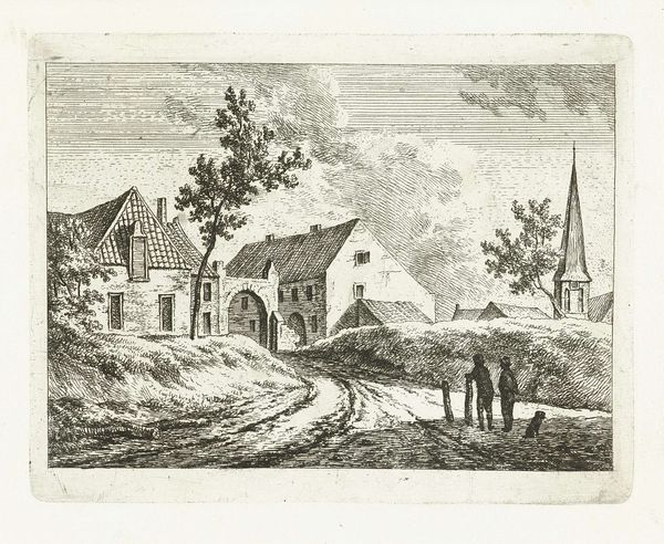 Curator: This print, attributed to V. Lignian and dating from between 1820 and 1850, is titled “Graf van Edward Stables te Waterloo,” or “Tomb of Major Edward Stables at Waterloo.” It appears to be an engraving. Editor: My first thought? Peaceful. And melancholy, in a way. It has the hushed feel of a place left behind, though it has a certain beauty, don't you think? Curator: Certainly. The composition, divided neatly into thirds, horizontally and vertically, balances the weight of the architecture with the ethereal sky. Notice the meticulous cross-hatching, a typical technique for creating tonal variation in engravings. The image invites semiotic reading regarding commemoration and the stoicism associated with neoclassical ideals. Editor: True, I see the neoclassical elements… but something about that drooping tree—it pulls at you, doesn't it? It almost hides a little fenced-off enclosure, like it's keeping a secret. A rather sorrowful secret. And those animals up front, do they represent…stability? Curator: Intriguing interpretation. Formally, the animals do provide a grounded foreground, juxtaposed with the geometric rigidity of the buildings. This tension serves to question our preconceived notions regarding life versus death. Editor: And there are these seemingly rough textures in the building against a calm skyline, creating, perhaps, tension or contradiction. Is it simply documenting the Tomb of Major Stables? What does it *mean* to draw an old building at all? Curator: Precisely. The tension underscores the complex relationship between the concrete and the abstract, historical specificity and universal themes, allowing for varied responses such as ours. Editor: So, at the end of our musings, it seems to me this simple print resonates with an intriguing power. Beyond its classical facade and somber presentation. Curator: A well-conceived impression indeed. I conclude that its inherent compositional complexities offer far more than a simple commemorative image.