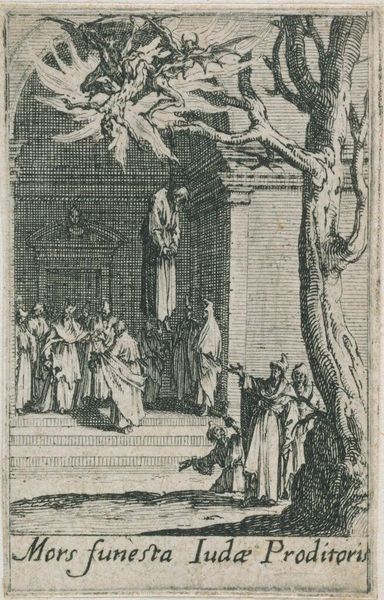 Editor: Here we have Jacques Callot's etching, *Christ before Caiaphas*. It's quite small, only a few inches, but incredibly detailed. The scene feels both theatrical and brutal. What story does this image tell, beyond the biblical narrative? Curator: It speaks to the politics of image-making in the 17th century. Callot, working during the Counter-Reformation, uses the drama to reinforce religious authority, but also to critique earthly power. Notice the flag with "SPQR," a Roman symbol appropriated for religious display. Editor: So, it's about more than just illustrating a Bible story? Curator: Exactly. It's about the Church asserting itself amidst competing political forces. The theatrics serve a purpose: to impress upon the viewer the gravity of the moment and the institution's power. Editor: I see how the architectural setting amplifies that message! Curator: And how the small scale paradoxically enhances the impact. It's a meticulously crafted piece of propaganda, designed for a wide audience.