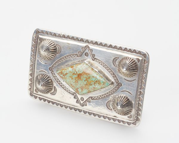 Editor: We're looking at a "Ceintuurgesp," a belt buckle, crafted in 1912 by Karl Johann Bauer, using silver and metal. It’s so delicate, intricate… almost like frozen lace. How do you interpret this work? Curator: It’s fascinating how Bauer has used these floral motifs. Notice the symmetry, how it echoes natural forms, but also suggests a stylized, almost codified language. Does the arrangement of those turquoise stones remind you of anything? Editor: Now that you mention it, the way the stones are placed between the silver, gives me the impression of looking at a symbolic gateway of sorts. Is it meant to hold a deeper significance beyond aesthetics? Curator: Exactly! Consider the period—Art Nouveau. There’s a profound interest in the organic, but also a yearning to elevate everyday objects to the level of art, imbued with meaning. Perhaps the buckle symbolizes not just closure, but a passage, a connection… maybe even to nature itself. It also speaks of feminine identity. How does the item change when a person wears this? Editor: I hadn’t thought of it that way. So, it’s not just about beauty; it’s a wearable emblem loaded with symbolism. And wearing something beautiful that speaks to something so grand. I guess beauty becomes more than superficial then. Curator: Precisely. It becomes an intimate form of storytelling, connecting us to a cultural narrative. The belt buckle does hold together more than a dress. It is Bauer’s memory and identity being shared by us now. Editor: That’s such an interesting idea to ponder. It really makes me appreciate the artistry and deeper layers of meaning embedded in even the smallest details.