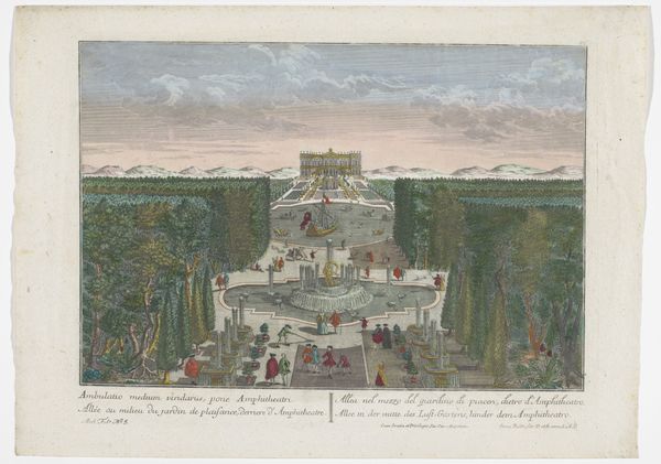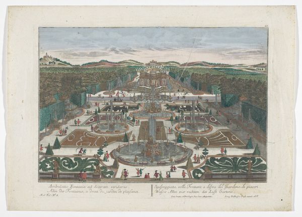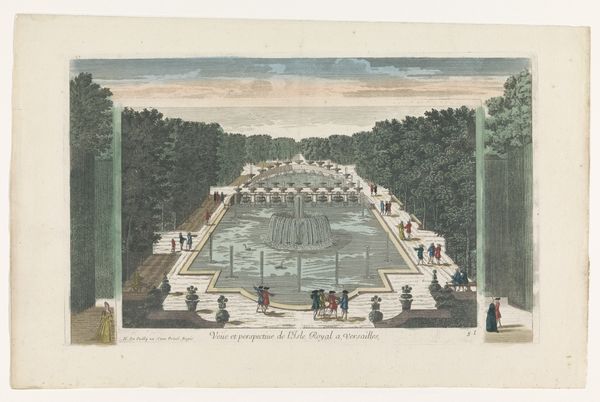 This print, made by Basset in the late 18th or early 19th century, offers a meticulously rendered view of the fountains within a Spanish royal garden. The image evokes the power and status of the Spanish monarchy through its illustration of their expansive, ornamented gardens. The artist employs a formal, symmetrical composition, reinforcing the sense of order and control emblematic of royal authority. Spain's colonial wealth, extracted from the Americas, allowed for such extravagant displays of landscaping. The garden, therefore, becomes a stage for the performance of royal power, a visual expression of dominance over both nature and society. As art historians, we look beyond the aesthetic surface, researching the economic and political conditions that made such images possible. We can ask, how did the Spanish monarchy use images like these to project an image of power? And what was the experience of those excluded from this carefully constructed paradise?