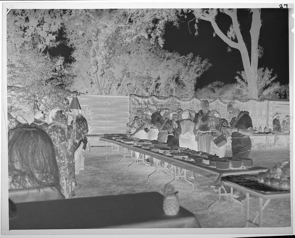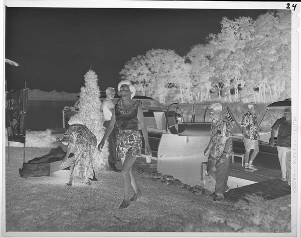 Editor: This photograph, "Untitled (men standing around hanging dead deer)" by Jack Gould, shows exactly what the title says. It’s quite a stark image. What kind of story do you think it’s trying to tell? Curator: Well, without a date, we can only speculate about the historical context. The presence of a uniformed officer suggests a possible examination of hunting regulations, or perhaps even a commentary on rural authority. Editor: Authority? Curator: Yes, consider the staged nature. Are they presenting the deer as evidence, or trophies? Does the public display of the animal reinforce power dynamics within the community? Editor: That's a good point; I hadn't thought about it that way. Curator: Also, the image's distribution through institutions like the Harvard Art Museums – what does that say about how we frame and consume these rural scenes today? Editor: It definitely gives me a lot to consider. Thanks!