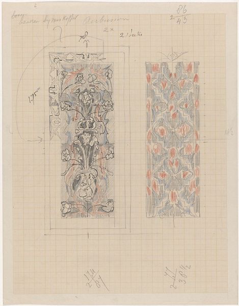 Curator: Carel Adolph Lion Cachet created this drawing, "Decoratief ontwerp met acht zittende vrouwen," sometime between 1874 and 1945. It resides here at the Rijksmuseum. Editor: I'm immediately struck by its almost eerie precision. The composition is undeniably meticulous. It almost seems to vibrate with implied movement within this gridded cage. Curator: Indeed. The inherent qualities of the work indicate its grounding in Art Nouveau. The rhythmic repetition of organic and geometric forms work in perfect harmony, yet there's tension because they are contained, mapped out on a grid. It's like a beautiful system ready to come undone. Editor: It’s also clear this is design work – a preliminary sketch for something more, judging from the graphite and paper. Think of the skill involved to map out so much detail on a tight graph. It begs questions of the artisan labor behind luxury ornamentation. Did Cachet's designs mask or illuminate those efforts? Curator: A complex inquiry. One cannot ignore the visual dance here. Note how each element—figures, curls, and volutes—mirrors and refracts the others. The drawing offers a network of signification, playing on the dichotomy of positive and negative space in its structure. Editor: That focus on space underscores the broader consumption economy this design implies. Designs like these would’ve fueled demand for certain kinds of handcrafted objects for a moneyed elite. Curator: A fair point. In considering the historical context, your emphasis reminds us how such visual harmony could also disguise socioeconomic stratification. Editor: Absolutely. It gives us so much to unpack beyond its face value, no? Curator: Exactly. A seemingly simple pattern reveals much when scrutinized. Editor: Indeed; design never exists in a vacuum. It shows how production matters. Curator: Very well stated. Thank you for offering that perspective on process.
