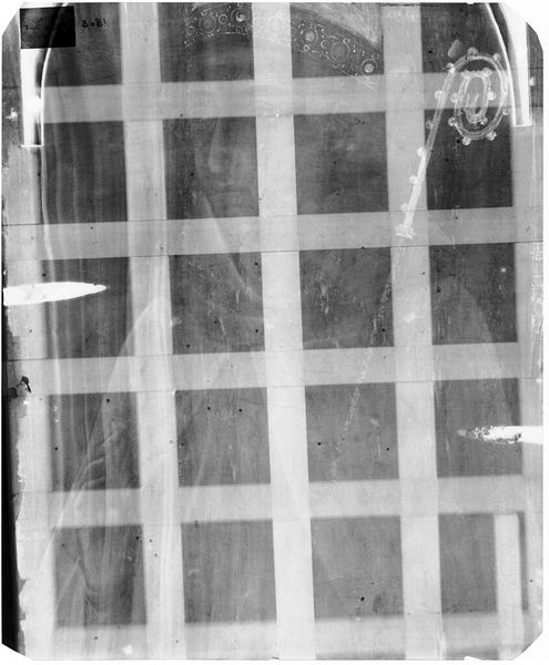 Editor: This is an x-radiograph of Cosimo Rosselli's "Portrait of a Man", residing at the Harvard Art Museums. Seeing beneath the surface like this, through the layers of paint, it’s almost ghostly. What hidden stories do you think it reveals? Curator: The grid pattern superimposed on the portrait reminds us that images, even portraits, are constructed. X-rays reveal not just the artist’s process, but also the evolution of cultural memory. What does it mean to unveil these hidden layers? Editor: It feels like we're excavating a memory, seeing the underlying structure. Curator: Precisely. It raises questions about authenticity, the role of the artist, and the stories we project onto images. It makes you wonder, what will future generations see beneath our surfaces?