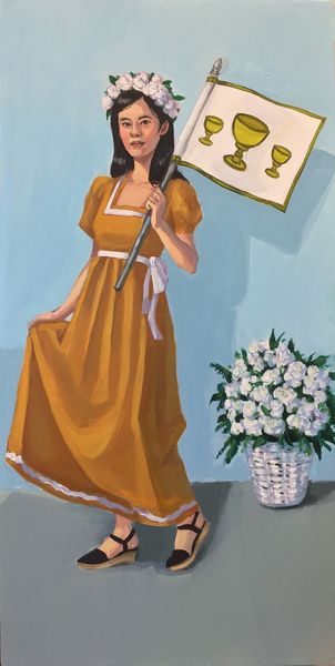 Zoe Hawk painted "The Empress" sometime in the late 20th century with what looks like layers of acrylic. It’s a world of flat planes, not fussed about blending, just stacked up. Look at the dress, all those rose colored folds, kinda stiff, like it’s been starched and ironed within an inch of its life. The paint's opaque, dense, no light getting through here. And then, those balloons, bobbing around, they look like hard candies, almost good enough to eat. There's a real directness to the whole thing, like each element is doing its own thing. It reminds me a little of Balthus, with his slightly unsettling, staged scenes. But Hawk brings her own sensibility. Ultimately both artists remind us that art doesn’t have to be about answers, it can be about holding onto the questions.