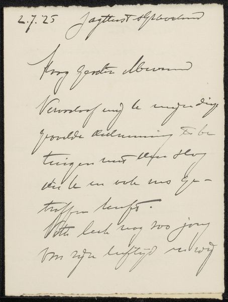 Curator: Immediately, I'm struck by the dynamic energy embedded within this piece—the restless dance of the linework practically leaps off the page. Editor: Indeed! Before us, we have “Brief aan Jan Veth,” a drawing made sometime between 1904 and 1908. The artist has utilized pen and ink to craft this intriguing work. Curator: And "intriguing" it is! Look at the loops, the sharp angles... it speaks to me of someone deeply immersed in thought, maybe even a touch agitated. It’s visually stimulating because there is no ease or harmony. It is Expressionist and feels psychologically penetrating. Editor: Observe how the dense concentration of lines at the center anchors the composition. Notice the interplay of thick and thin strokes; the contrasting textures evoke both chaos and clarity—as though the artist simultaneously intended for a script but with a deliberately disturbed line, defying convention in typography. Curator: The art of hand-lettering goes beyond mere communication. Each curve, each flourish, speaks of a particular mindset in a given historical period. As an item seemingly salvaged from someone's drawer, this feels highly intimate. The words form a landscape of thought, capturing a fleeting moment of reflection in permanent form. This makes it invaluable! Editor: The very choice to use hand-lettering suggests an intent to reclaim personal expression at a time when printing was becoming increasingly mechanized. Even in the absence of a defined, clear grid, this drawing presents a compelling and structured statement. Its beauty is rooted in raw intention. Curator: Precisely. It encapsulates not just individual expression but an era defined by rapid societal changes, which are now captured in something that feels almost relic-like. Editor: Examining “Brief aan Jan Veth” is a reminder that sometimes, the most poignant stories are spun not in grand, epic narratives, but within the simple, immediate act of crafting lines and forms. Curator: For me, this glimpse into a writer's soul speaks of universal human sentiments across the divide of decades; a precious message that time has not faded.